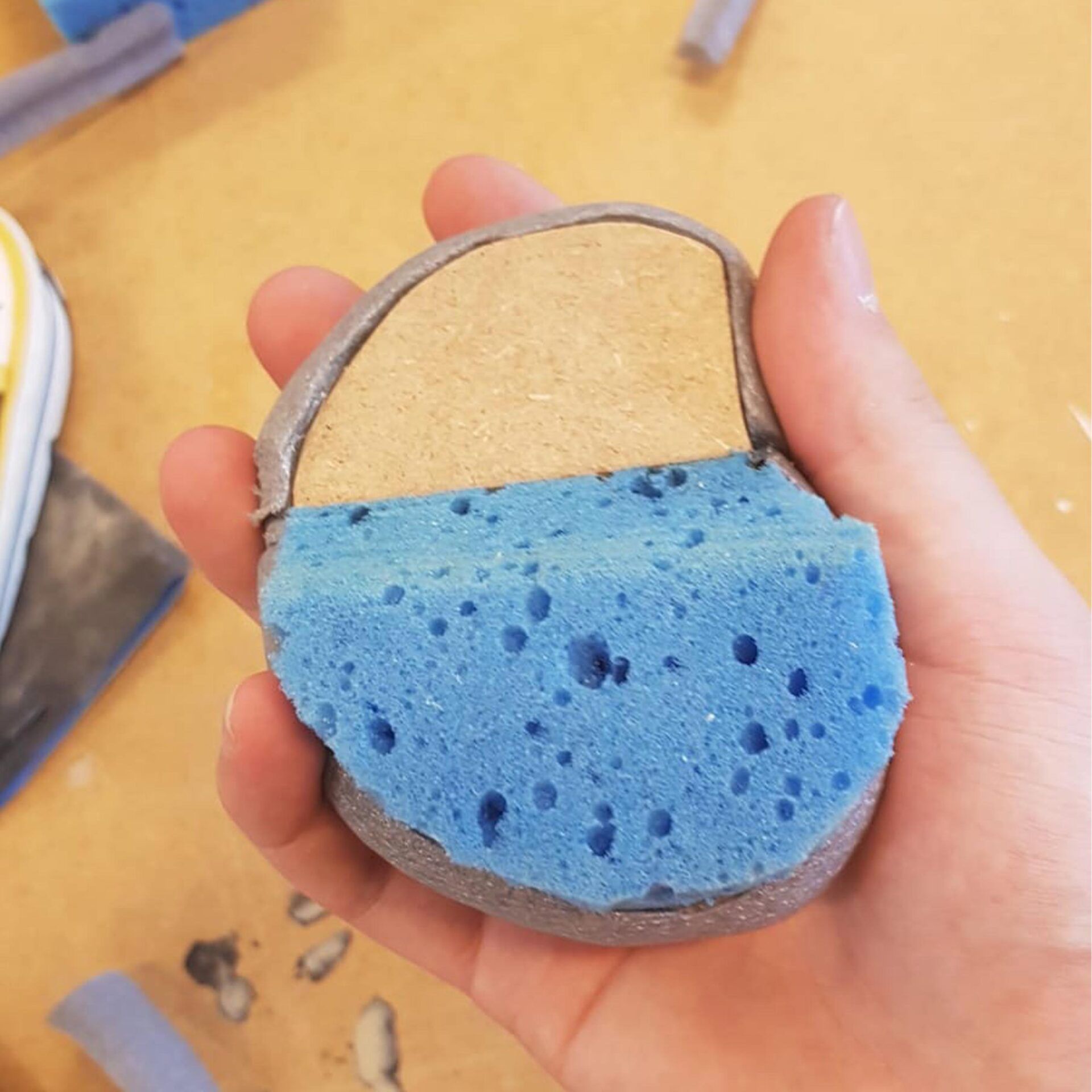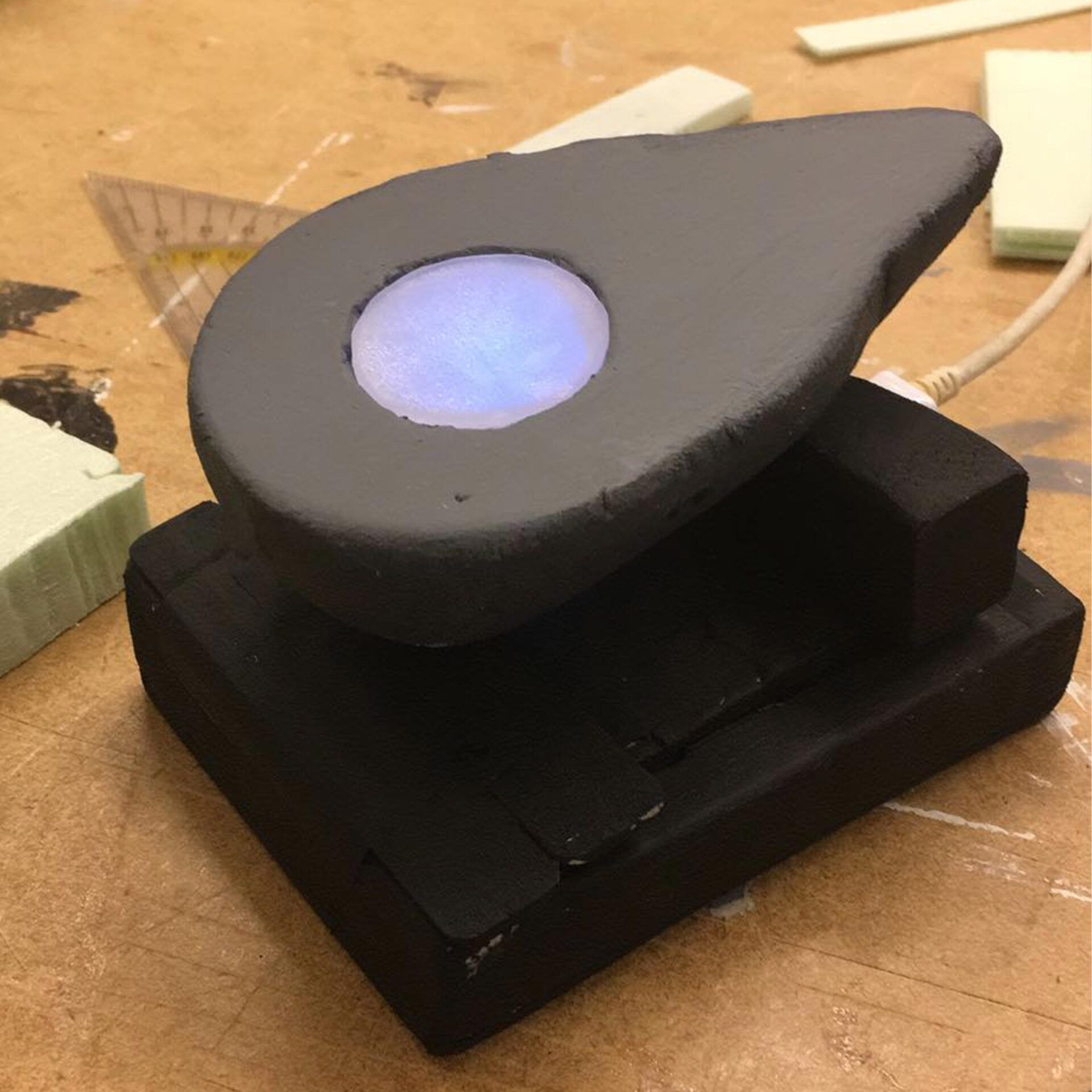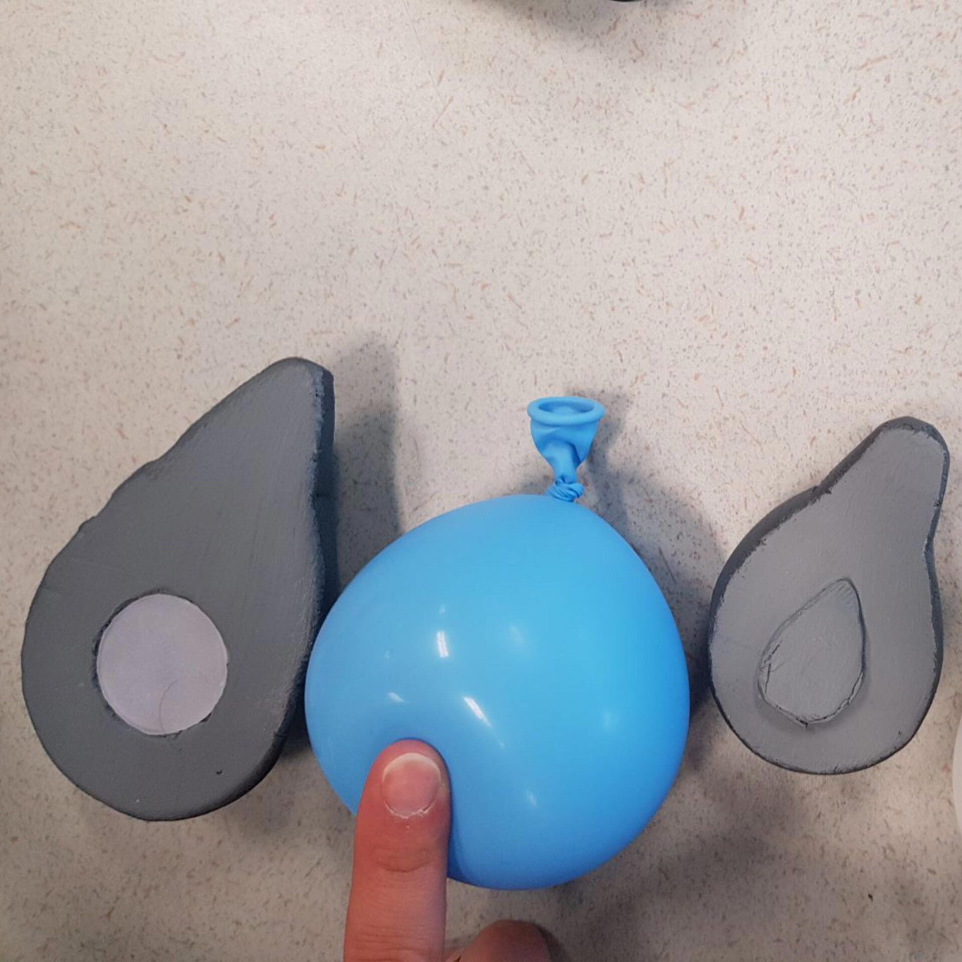 The device has to be held in the user’s hand. The speed of the inflation and deflation will be measured by the nose device. This nose device measures the current respiratory rate. In this way, people can really focus on their breathing, and they will calm down by lowering their respiratory rate. Since they have to hold the tool in their hand, they feel when they have to breath in, because the tool inflates. When they have to breath out, the tool deflates. The design is made of wood, the inflation and deflation part of the design is soft to make the technical aspect of the inflation and deflation visual. The technical prototype of the product is visualized with a 12V DC air pump, an air valve and a balloon.