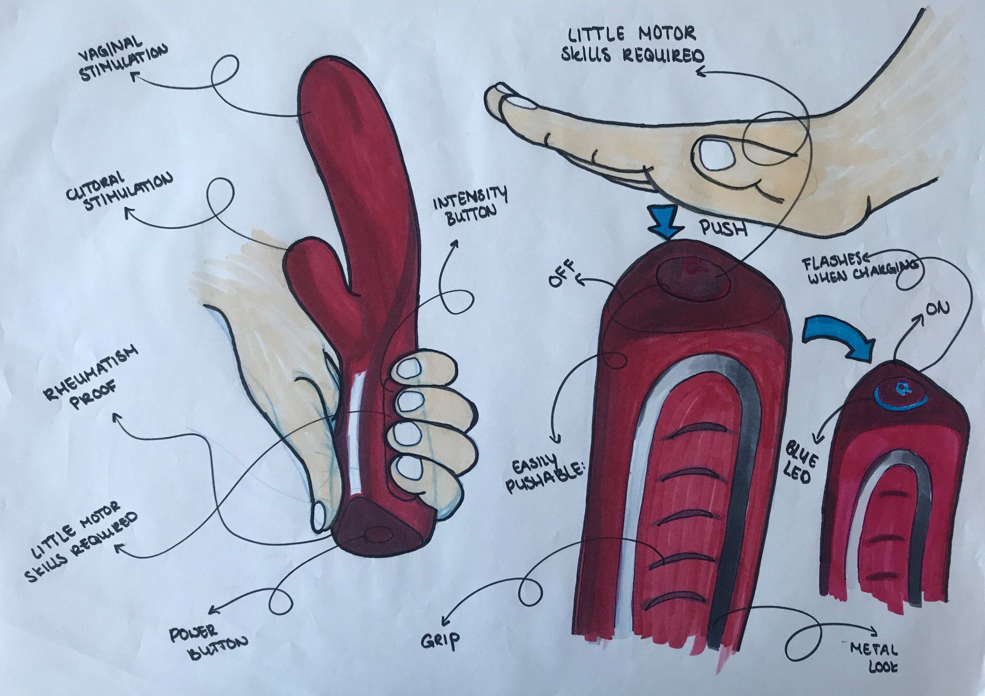 Because everyone has to deal with this at some point, I designed a vibrator which takes this into account. The vibrator’s grip has a different shape, which is triangular such that the position of the wrist can stay in line with the forearm, which means that the wrist doesn’t have to bend. Moreover, it is easier to naturally hold the device without pain when the grip is triangular. Furthermore, the button of the vibrator is over the full length and has a structure to make it clearly tangible. The button can be pushed with four fingers to change the vibration pattern. Due to the bigger button and straightforward use, it reduces the need of fine motor skills. Moreover, the exterior power button allows for simple usage and can easily turned on and off with for example your full hand or with the table. This is to reduce the need of fine motor skills as well. The vibrator has a magnetic charging mechanism. Due to the magnetic charging port, the user is easily guided towards the charging station.